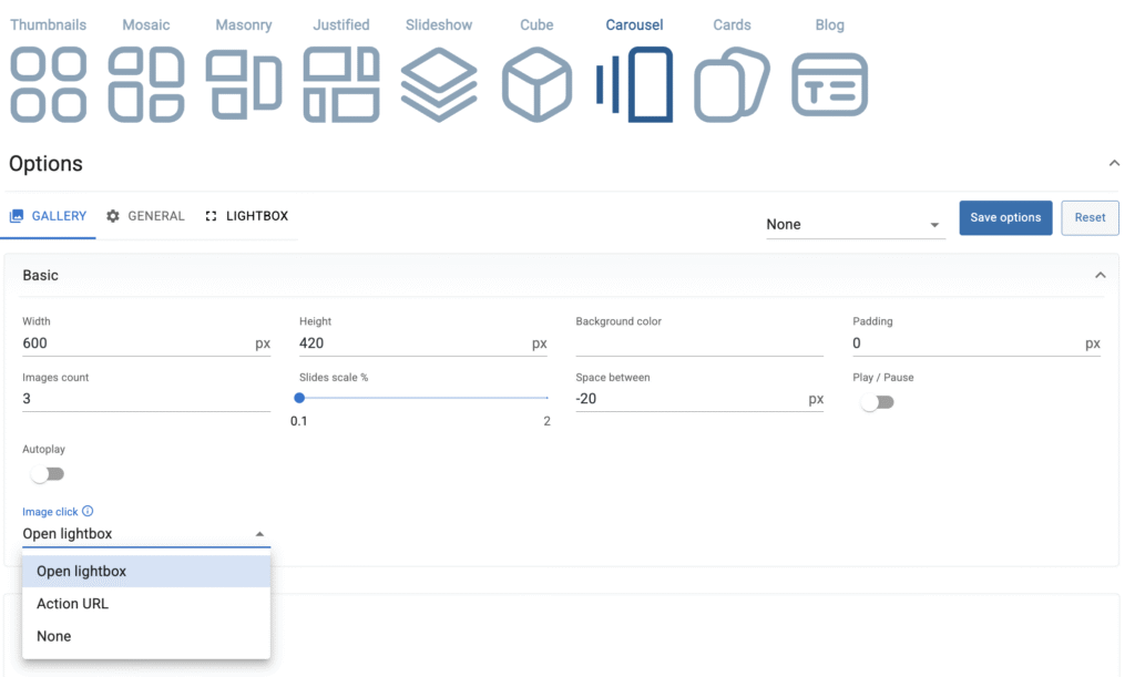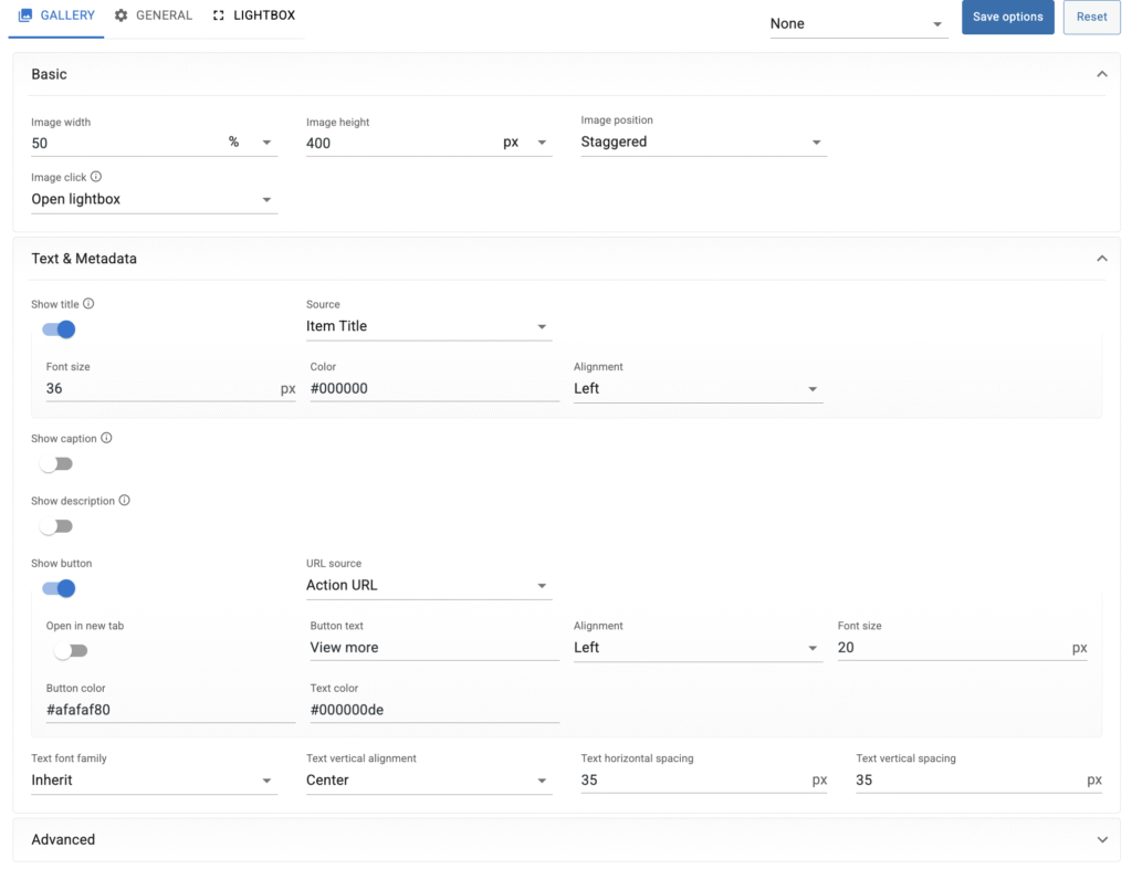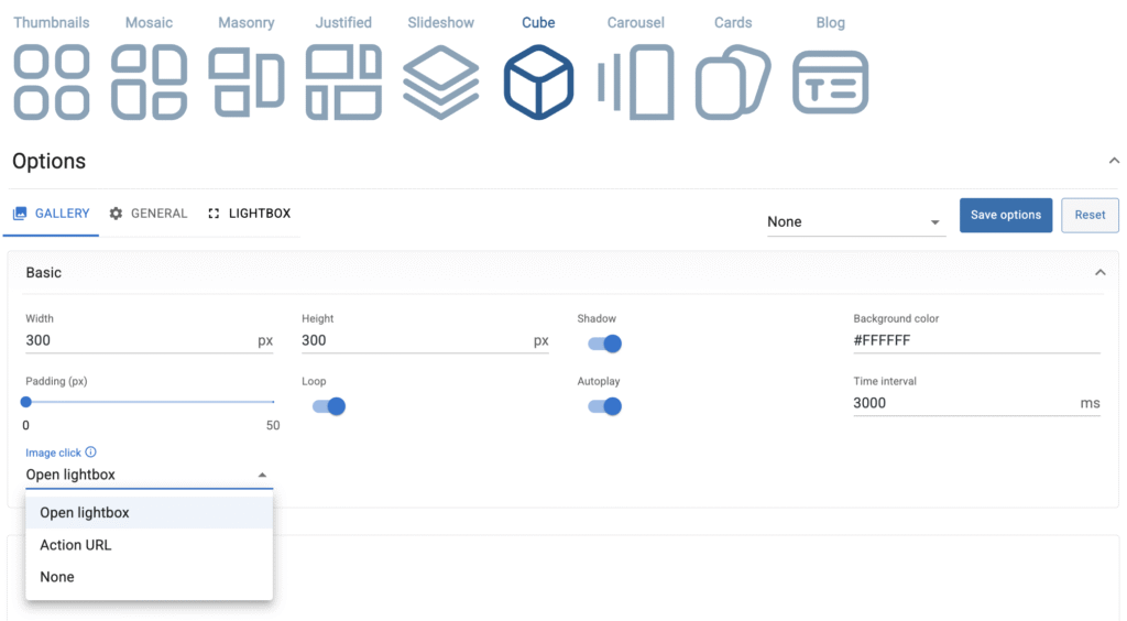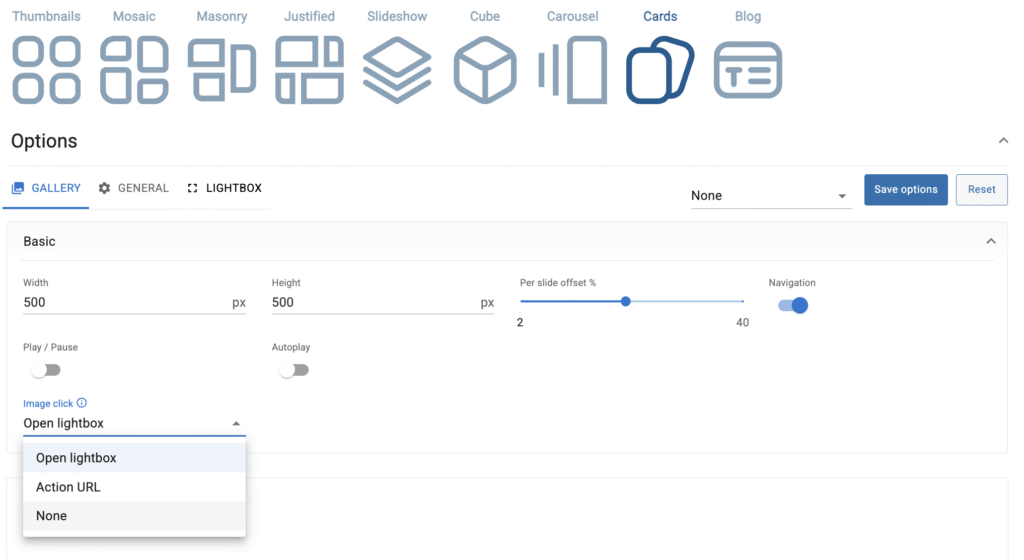 - Image click actions – Decide what happens when a visitor clicks a card: open a lightbox, go to a custom URL, or do nothing.