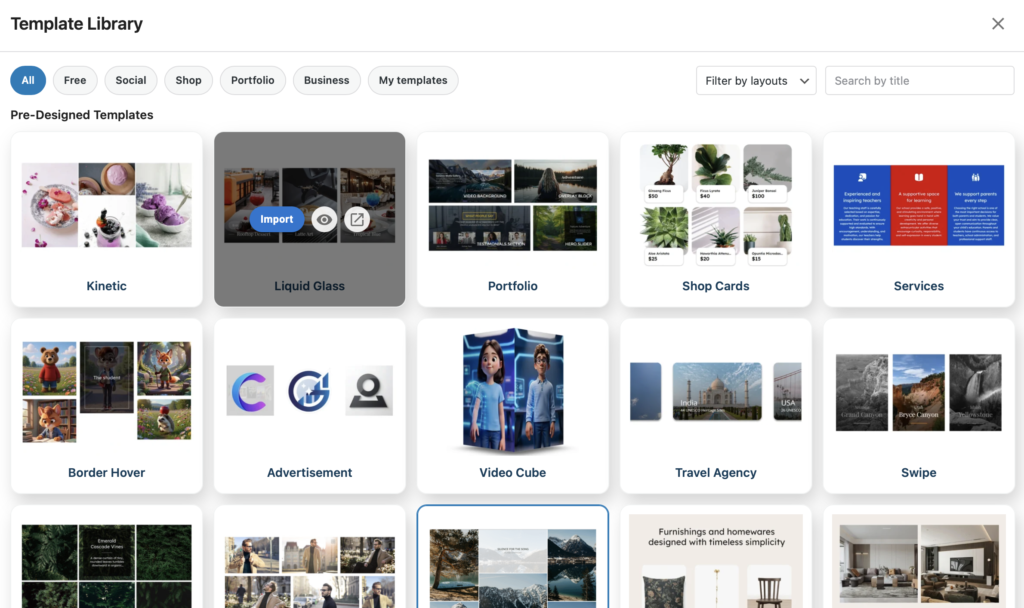 Instead of choosing a layout and then adjusting spacing, hover effects, lightbox settings, and card styles from scratch, you pick a template that already works — and customize from there. Each template is fully responsive and built for real use cases, not just demos.