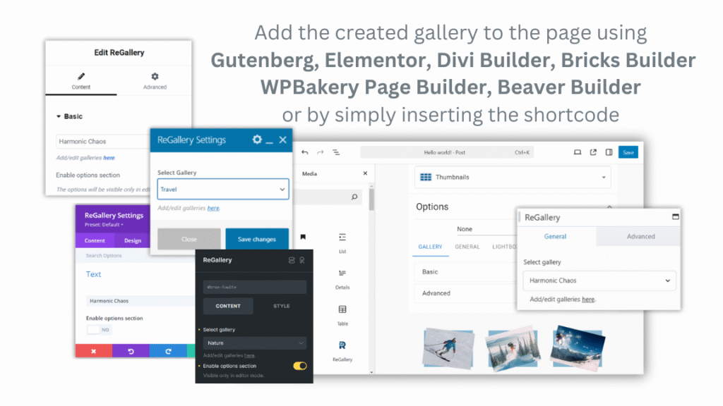 When it comes to building a WordPress site, nothing slows you down faster than a plugin that doesn’t play well with your page builder. This is where Re Gallery really shines. Whether you’re designing with Gutenberg, Elementor, Divi, or even Bricks Builder, Re Gallery lets you drop your galleries right into your layout and see your changes live. No messy shortcodes, no guesswork just smooth, visual editing that feels like it was made for modern WordPress creators.
